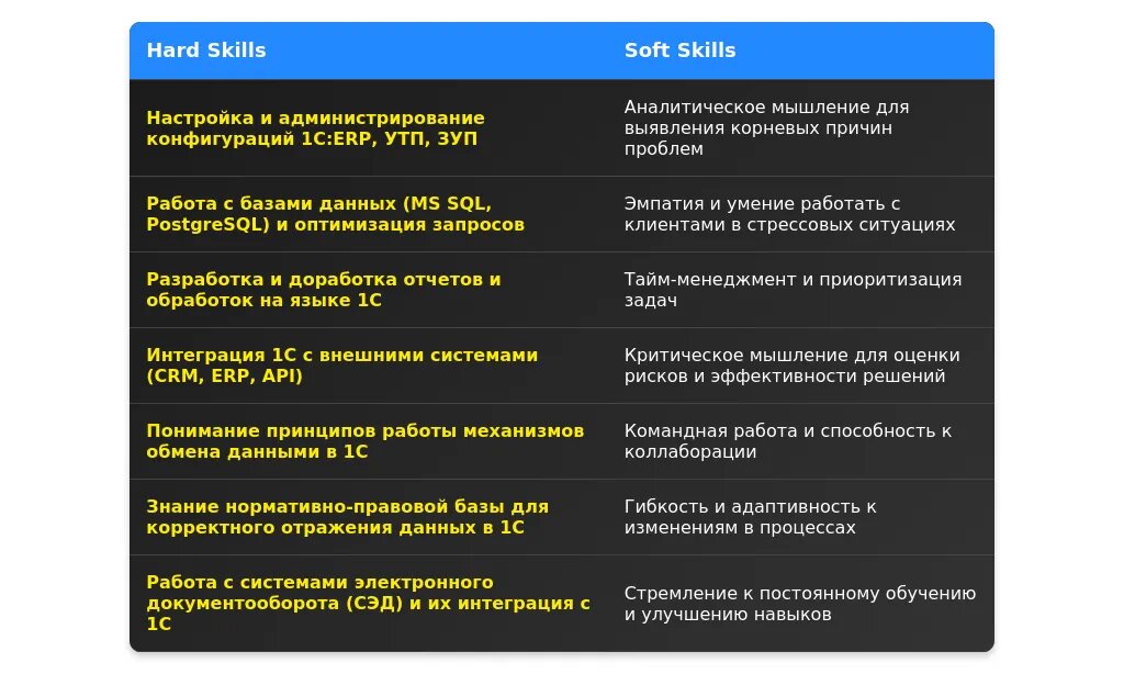 Пример адаптации навыков: 1С:Бухгалтерия, SQL, разработка отчетов, настройка конфигураций.