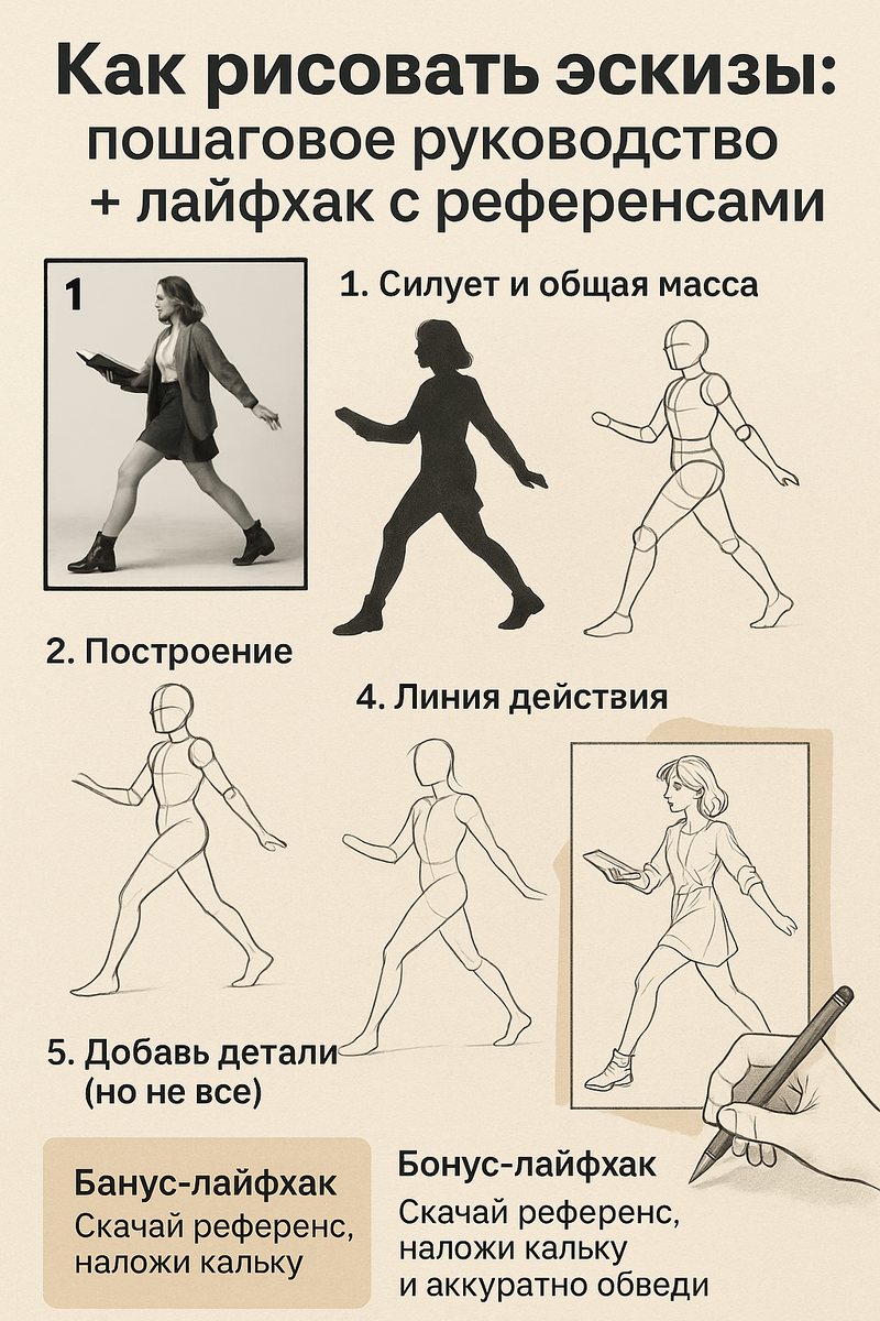 Эскиз — это не просто набросок, а первый шаг к полноценному произведению. Он помогает поймать идею, настроение и композицию. В этой статье я расскажу, как легко и поэтапно рисовать эскизы даже тем, кто не считает себя художником, и поделюсь лайфхаком, который сам использую каждый день. Начни с поиска вдохновения. Подойдут Pinterest, ArtStation, Unsplash или даже кадры из фильмов. Если ты хочешь нарисовать человека — найди позу. Если пейзаж — подбери интересную композицию. Лайфхак: Используй сайт Line-of-Action.com — он даёт случайные позы для рисования, как живой натурщик. Не спеши с деталями. Нарисуй общий силуэт — крупные формы без прорисовки. Это как лепка из глины: сначала общий объём, потом детали. 👉 Используй мягкий карандаш или цифровую кисть с низкой непрозрачностью. Разбей объект на простые формы — круги, цилиндры, кубы. Это упростит работу с перспективой и анатомией. Даже лицо можно упростить до шара и крестика для ориентира глаз. Это главная линия, которая задаёт динамику.