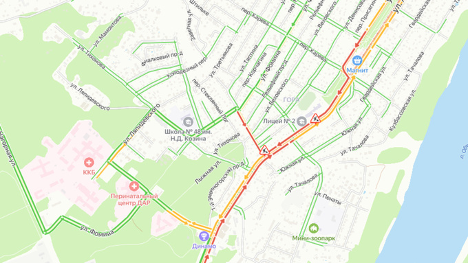 Затор и на выезд из города, и по направлению к его центру Серьезная автомобильная пробка образовалась на Змеиногорском тракте в Барнауле. Согласно данным сервиса "Яндекс.Пробки", проблемы с проездом есть в обе стороны – и в центр города, и на выезд из него. Затор образовался на фоне проведения дорожных работ. На выезд из города он начинается от перекрестка Змеиногорского тракта с переулком Кауфмана. При движении в центр города – от лицея № 2 до института имени Лисавенко. В целом дорожная обстановка на 15:00 оценивается в 7 баллов. Согласно ожиданиям сервиса, легче с проездом станет лишь к позднему вечеру. Больше материалов на amic.ru.