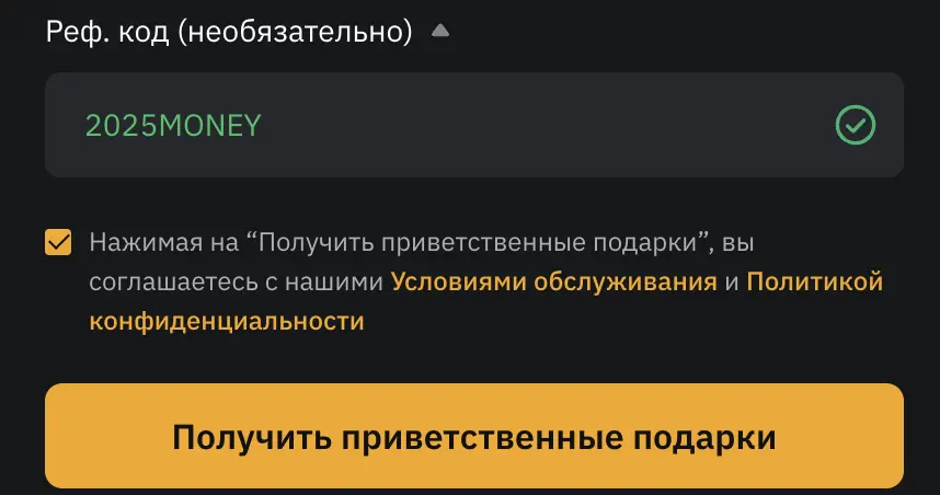 Реферальный код Bybit 2025MONEY — это ваш ключ к расширенным возможностям на одной из крупнейших криптобирж. Введите промокод 2025MONEY при регистрации на байбит в 2025 году, чтобы активировать приветственные бонусы: от щедрых вознаграждений на счёт до специальных акций и сниженных торговых комиссий. Начните торговать с преимуществом с самого первого дня! Промокод 2025MONEY открывает перед новичками на Bybit целый набор выгодных привилегий: Размер вознаграждений зависит от активности и уровня вовлечённости. Среди доступных бонусов: Чтобы получить бонусы с помощью кода 2025MONEY, выполните простую регистрацию на платформе: Если вы забыли ввести код во время создания аккаунта — не беда. У вас есть 14 дней, чтобы активировать его через раздел профиля «Присоединиться к комьюнити партнёра». Bybit предлагает широкую бонусную систему, поощряющую не только регистрацию, но и активную торговлю. Сразу после входа в аккаунт вы можете рассчитывать на: Торговые бонусы тоже впечатляют: Плюс дополнит