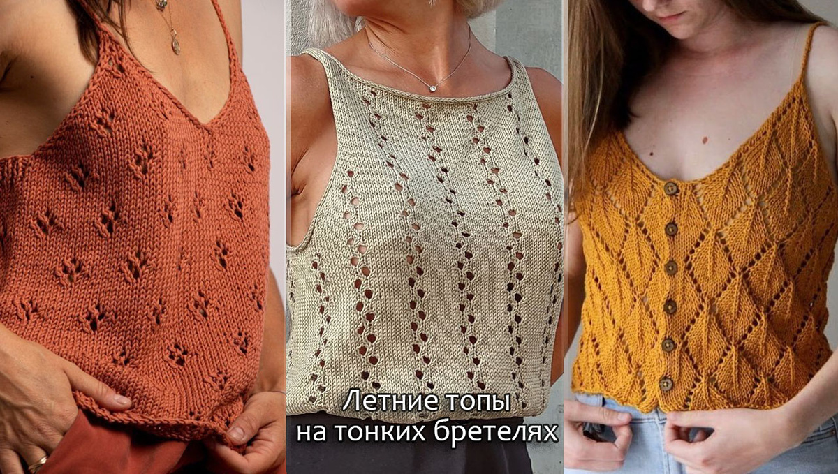 До лета еще целый месяц, однако тепло может нагрянуть неожиданно, а нам, как всегда, нечего надеть. Предлагаю связать простые топы из летних составов, таких как хлопок, лен или шелк, а полотно топа украсить легким ажурным узором.