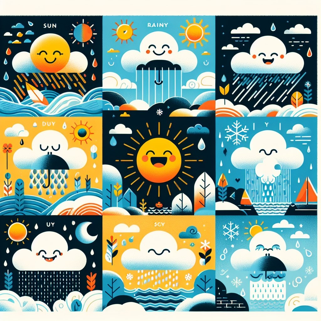 Поговорим о погоде ⛅❄☀ "Weather" - "погода" "Sunny" - "солнечно" "Rainy" - "дождливо" "Cloudy" - "облачно" "Snowy" - "снежно" "Windy" - "ветрено" "Icy" - "скользко" "Foggy" - "туманно" "I love sunny weather because it makes me happy." - "Я люблю солнечную погоду, потому что она меня радует."