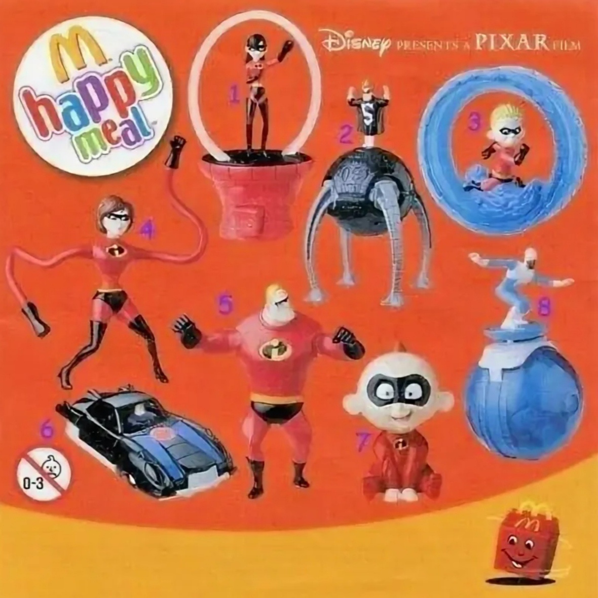 Суперсемейка - это компьютерный анимационный фильм 2004 года студии Pixar, рассказывающий о жизни супергероев. В этой серии из McDonald's нам представлены следующие игрушки: 1. Виолетта Парр (Фиалка) 2. Бадди Пайн (Синдром) Исключиш (Incredi-Boy) 3. Дэшиел Парр (Шастик) 4. Хелен Парр (Эластика) 5. Боб Парр (Мистер Исключительный) 6. Машина Мистера Исключительного (Incredmobile) 7. Джек-Джек Парр 8. Люциус Бест (Фреон) В моей коллекции из этой серии есть следующие игрушки: Если интересуют другие игрушки из McDonald's , то переходим на Главную страницу