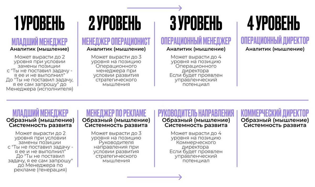 Реально вырастить из менеджера 2 звена в менеджера 3 звена? К теме прошлого нашего эфира про команду. При строительстве компании – вы создаете систему, где каждый сотрудник может стать ключевым звеном общего дела. Есть два типа талантов – два пути роста (мы их характеризовали как системные и шиложопые, но на мой взгляд это устаревшая классификация. Мне нравится другая, когда вы по умолчанию не нанимаете раздолбаев): В вашей команде скорее всего есть два типа ключевых игроков, и каждый требует особого подхода. АНАЛИТИКИ (СТРАТЕГИ, СИСТЕМЩИКИ) Это "мозги" вашего бизнеса – те, кто выстраивает процессы, оптимизирует и систематизирует. Путь роста: Младший менеджер → Операционщик → Операционный директор. Как развивать: Давайте сложные задачи на оптимизацию, учите видеть бизнес как систему. С ОБРАЗНЫМ МЫШЛЕНИЕМ/СИСТЕМНЫЕ (генераторы идей, коммуникаторы) Это "двигатели" роста – те, кто создает новое, развивает направление и масштабирует. Не путать с людьми, которые ещё находятся