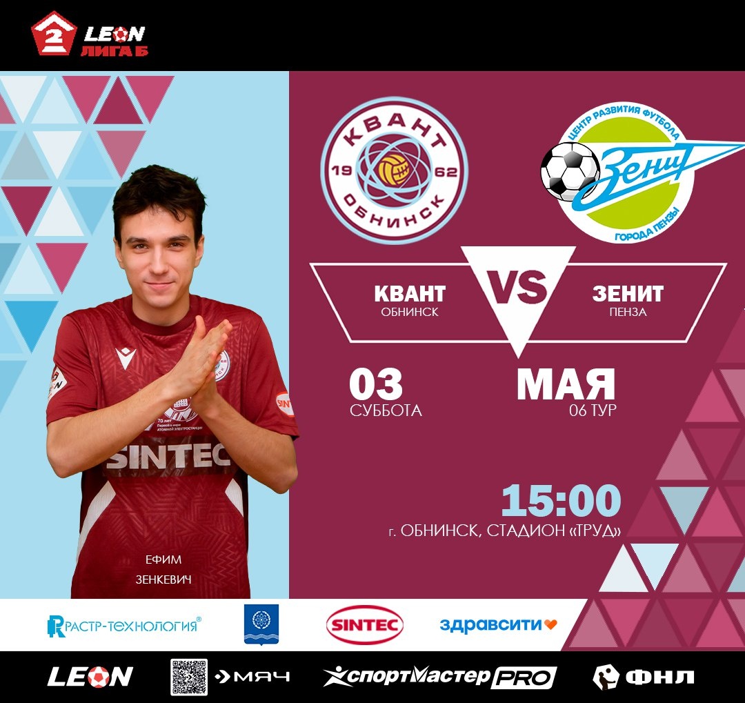 3 мая в субботу приглашаем болельщиков на игру Квант 🆚 Зенит (Пенза)! В этом сезоне соперник удачно стартовал, а в минувшем туре дома обыграл лидирующее брянское Динамо. Квант в свою очередь открыл счёт забитым мячам. История личных встреч у клубов равная: по две победы и 3 ничьи. Причём оба победы Зенита состоялись в прошлом сезоне. Начало игры в 15:00!
