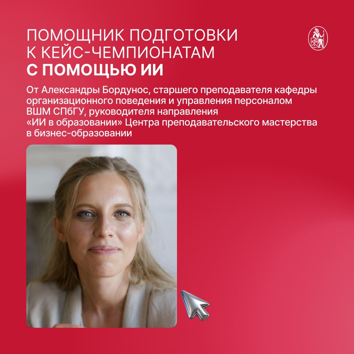 🤝 Искусственный интеллект — это не только забавная игрушка для создания смешных картинок, но и мощный инструмент, способный помочь в работе или учёбе (конечно, в соответствии с Политикой применения генеративного искусственного интеллекта студентами) 👜 Александра Бордунос, старший преподаватель кафедры организационного поведения и управления персоналом ВШМ СПбГУ, руководитель направления «ИИ в образовании» Центра преподавательского мастерства в бизнес-образовании, поделилась инструкцией по использованию искусственного интеллекта в кейс-чемпионатах. В карточках вас ждёт подборка инструментов, доступных без оплаты, а также — подробные промпты и примеры. 💫 Сохраняйте пост себе — он вам точно пригодится ещё не один раз!