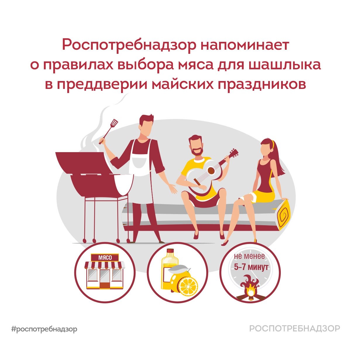 Правила выбора мяса для шашлыка в преддверии майских праздников С наступлением майских праздников и началом сезона пикников, дачных поездок и шашлыков, Роспотребнадзор рекомендует соблюдать несколько простых правил при выборе мяса: 1️⃣ Обратить внимание на внешний вид и цвет мяса, состояние жира и сухожилий, а также запах и консистенцию. Свежее мясо отличается белым, кремовым или желтоватым жиром, свежим и естественным запахом без посторонних примесей, а также плотной консистенцией. Если надавить на него, ямка быстро выравнивается. 2️⃣ Не стоит покупать готовые мясные полуфабрикаты у случайных продавцов. При отсутствии информации о наименовании организации, юридическом адресе и режиме работы лучше отказаться от покупки. 3️⃣ Если вы купили некачественный продукт, обратитесь к продавцу с письменной претензией. В случае отказа от приемки продукции, сообщите об этом в Роспотребнадзор. Следуя этим рекомендациям, вы сможете насладиться шашлыками на майских праздниках и сохранить здоровье св