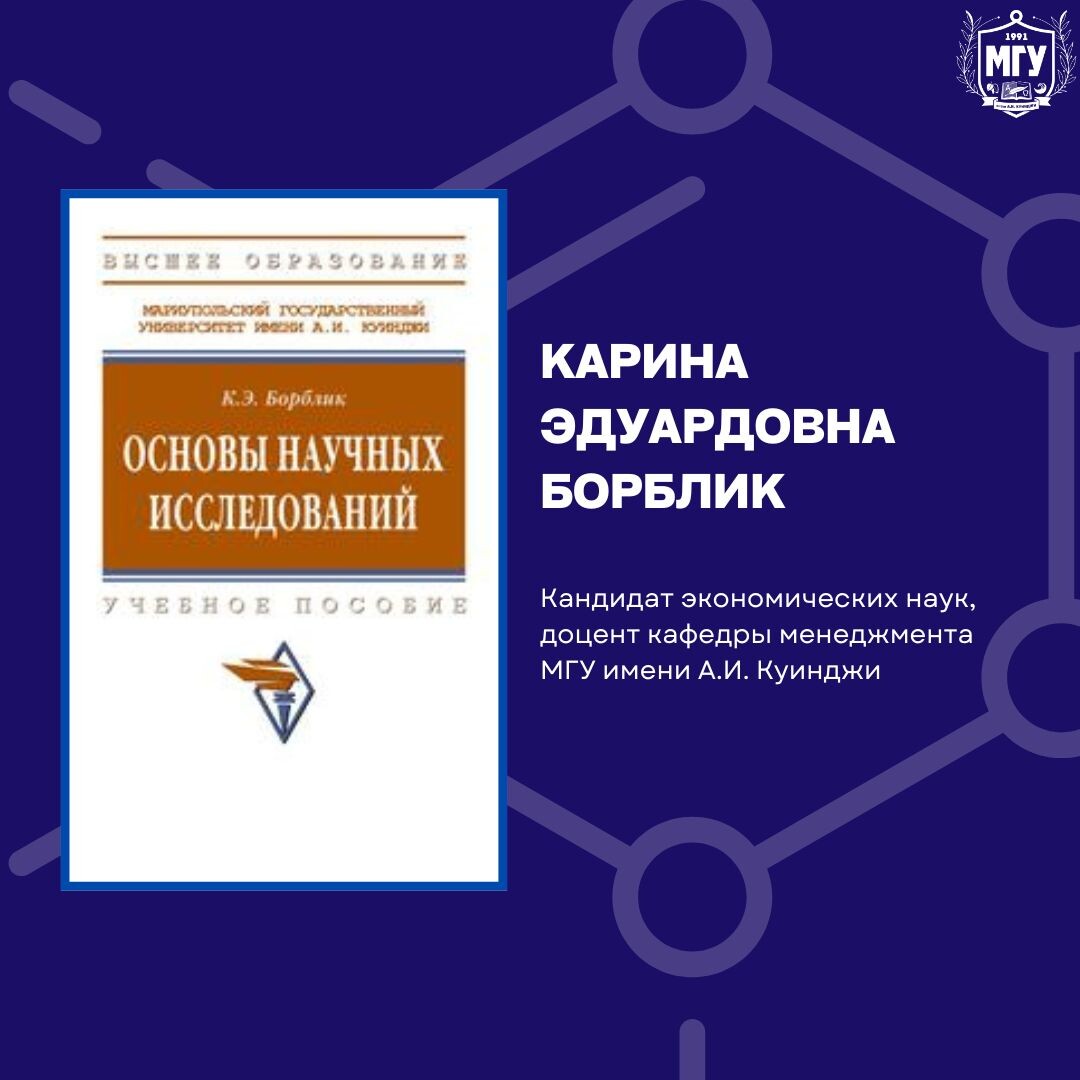 Кандидат экономических наук, доцент кафедры менеджмента МГУ имени А.И. Куинджи Карина Эдуардовна Борблик выпустила учебное пособие «Основы научных исследований» в рамках сотрудничества с ООО «Научно-издательский центр ИНФРА-М». В пособии выделены: ключевые этапы подготовки и проведения научных исследований; формы научной деятельности: от выбора темы до внедрения результатов в практику; советы по работе с информацией и оформлению научных трудов. Учебное пособие предназначено для студентов экономических направлений и будущих менеджеров, стремящихся проводить качественные и прикладные научные исследования. Поздравляем Карину Эдуардовну и желаем новых научных достижений! Студентам, аспирантам, сотрудникам университета книга доступна в подписке на ЭБС Znanium.