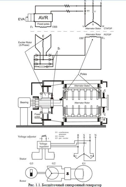 Бесщёточные синхронные генераторы широко применяются в энергетике, судовых установках, резервных электростанциях и других областях, где требуется высокая надёжность и минимальное обслуживание. Их ключевое преимущество – отсутствие щёточно-контактного узла, что повышает долговечность и снижает потери. В данной статье рассмотрены: Основные компоненты генератора (см. рис. 1.1): Ключевые особенности конструкции: ✔ Отсутствие щёток и контактных колец – ток возбуждения передаётся через вращающийся выпрямитель.