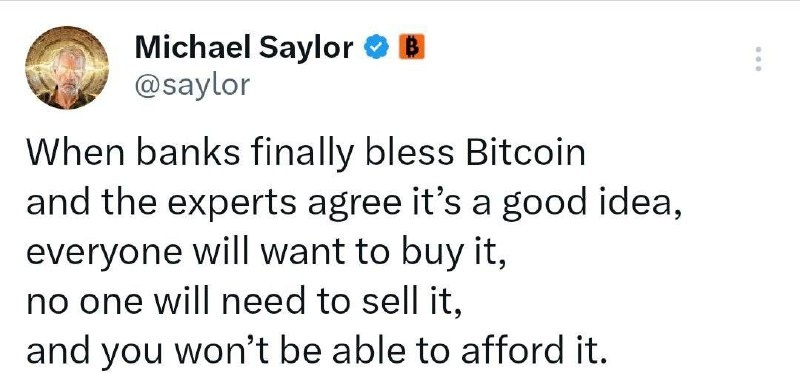 🕕Майкл Сейлор: «Когда банки наконец благословят биткоин и эксперты согласятся, что это хорошая идея, все захотят его купить, никому не нужно будет его продавать, а вы не сможете его себе позволить»