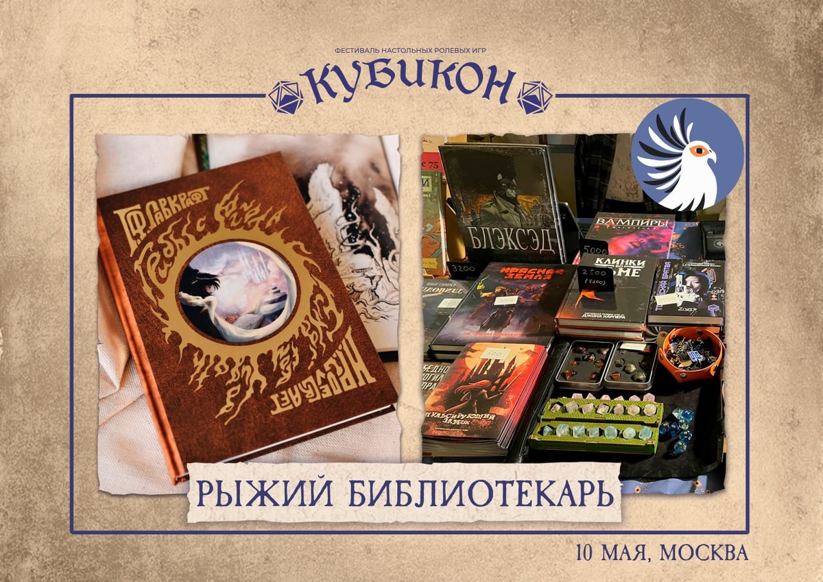 Библиотекарь едет на «Кубикон»! Как известно, многие ищут на фестивалях тот самый счастливый D20. Помощники Рыжего Библиотекаря уже начали заряжать игральные кости удачей, чтобы привезти на «Кубикон» как можно больше того и другого. И конечно, в лавке, которую мы развернём, вы найдёте настольные ролевые игры — наши и других русских издательств. На фестиваль собирается невероятное количество гостей. Будет огромная игротека, мастер-классы и лекции, презентации, шикарная ярмарка, а главное — люди, создающие ту самую атмосферу. Если никогда не бывали на фестивалях, обязательно приходите! Это как подниматься в горы или увидеть море — вроде бы ничего такого, но запоминается навсегда. Кубикон пройдёт 10 мая в Москве по адресу: Никулинская ул, д. 2, к. 1. Двери фестиваля будут открыты c 10:00 до 20:00. Мы там будем от рассвета и до заката. Приходите, мы вас ждём!