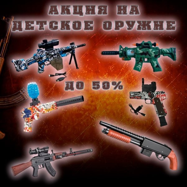 Акция на игрушечное оружие! Скидки до 50%! Подробности уточняйте у наших менеджеров! Срок действия акции: 30.04.2025-10.05.2025 💌 Наши контакты: nata@igrotoys.ru info@igrotoys.ru igrotoys2016@yandex.ru 8 (903) 150-43-04, 8 (999) 823-58-38 тел; WhatsApp