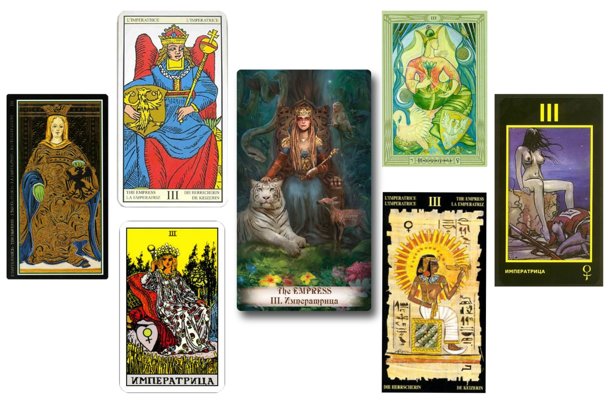 Вы видите изображения наиболее популярных колод: Императрица 3 (Хаос) (Стихи Александра Тибатина.) Описание и значение Среди красот природы Императрица — Всех возможностей и проявлений царица! Мудра, как змея, и по-женски игрива, Как обезьянка… (справа сидит шаловливо). Перед троном цветы красивые благоухают, Силу Её магнетизма они для всех означают. Чуткость скрывает в олене пятнистом и робком. Императрица водит людей по жизненным тропкам. СУТЬ АРКАНА Природы буйство подчиняет, Хаосом без колебаний управляет. Всему дает шанс в мир явиться, Правит всей Жизнью она, Императрица! Афоризмы аркана Императрица (Игорь Оленев) — Можно выиграть и малыми козырями, но для этого нужен удачный расклад.