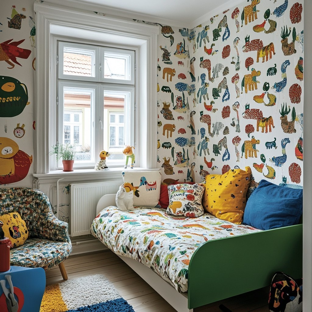 Создано на основе запроса: One wall of the children's room is covered with cheerful animal-patterned wallpaper