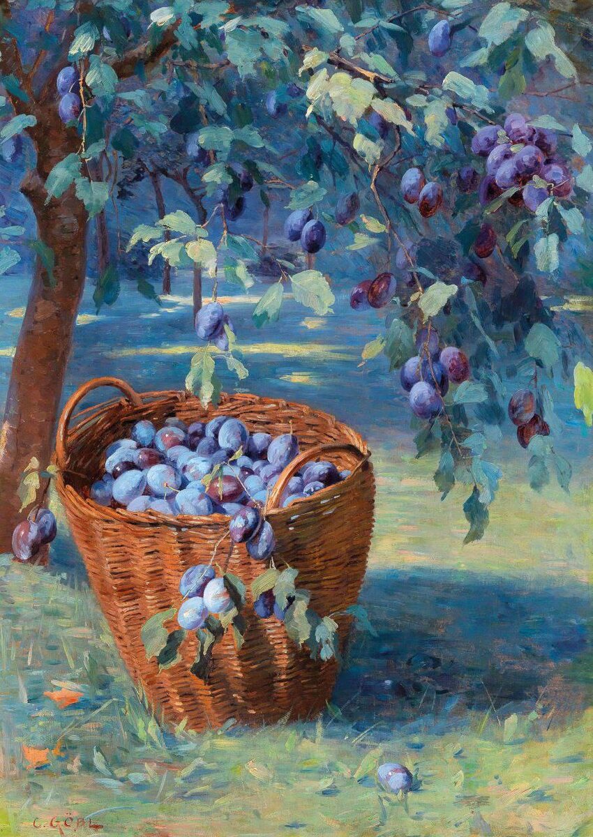 Камилла Гёбль "Урожай слив" Стоит отметить яркую передачу цвета и отточенность техники художницы. Объединение этих качеств придаёт картине реалистичность удивительную насыщенность. А в мазках, размывающих фон, прослеживаются черты импрессионизма.