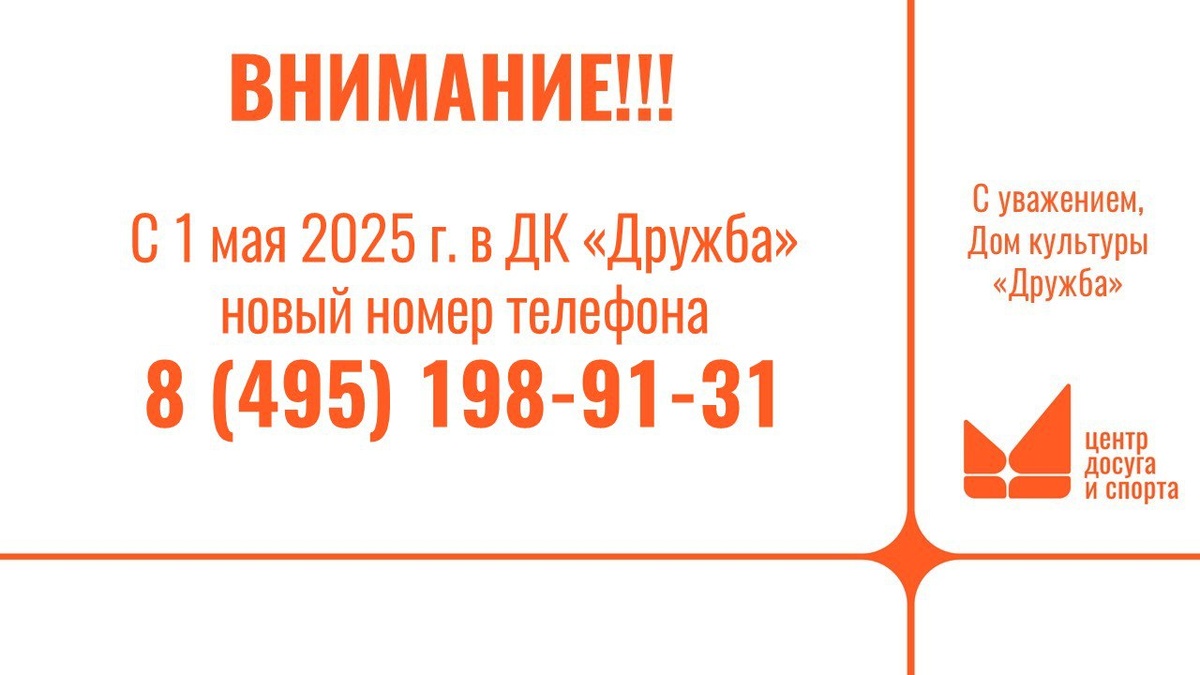 Внимание! С 1 мая 2025 года у нас новый номер телефона: 8 (495) 198-91-31 📞 Сохраните, чтобы не потерять! #ДКДружба
