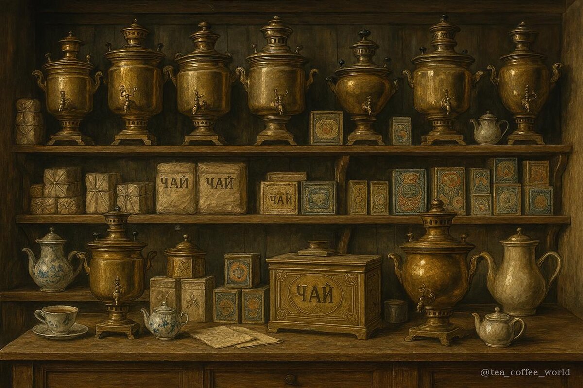 ИЗ РОСКОШИ В ОБЫДЕННОСТЬ: САМОВАРЫ, ТРАКТИРЫ И ЧАЙНЫЕ ФАБРИКИ 🇷🇺🫖 К концу XIX века чай в России перестал быть роскошью — он вошёл в народную жизнь, став частью и утреннего ритуала, и семейных посиделок. Помогли в этом сразу три вещи: самовар, трактир и чайная фабрика. 🫖 Самовар — главное украшение стола. Его изготавливали на заводах в Туле, Вятке и Суксуне. Он стал символом уюта, тепла, спокойного вечера. Считалось, что самовар должен шипеть ровно, а огонёк внутри — гореть мягко, как закат. 🍽 Трактиры — повсеместные «чайные пункты» в городах и на трактах. Там чай подавали с сушками, вареньем, сахаром-рафинадом. Пили его рабочие, купцы, крестьяне — каждый находил в нём долю тишины в шумной жизни. 🏭 Чайные фабрики начали появляться в Москве в 1860–1880-х. Крупнейшие — первая фабрика Перлова, затем Высоцкого и Кузнецова. Чай фасовали, ароматизировали, смешивали сорта. Он стал доступен, понятен и любим. 💬 Так из «деликатеса императоров» чай превратился в национальную традицию.