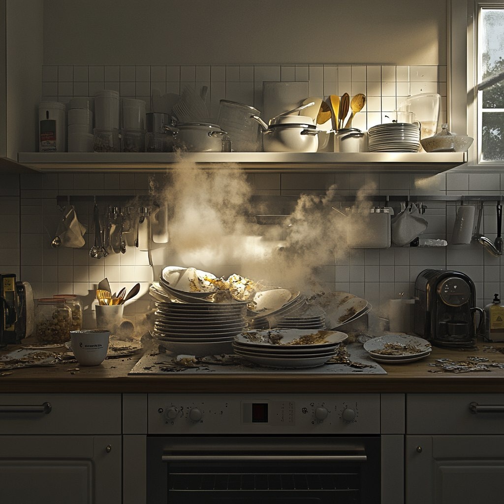 Создано на основе запроса: Generate a kitchen. The kitchen sink is piled high with greasy tableware, steam is rising, the kitchen is messy, with a frontal view and a long shot, in high definition --- Автоперевод: Генерировать кухню. Интересно получилось? 🤔 https://dzen.ru/id/65c0c65c86e4f837c27b24d7 #ИИ #AI #нейросеть #midjourney #art