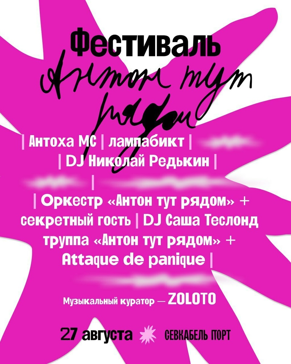 Фестиваль «Антон тут рядом» объявил первую волну артистов и музыкального куратора. Событие пройдет 27 августа в петербургском «Севкабель Порту». Сейчас в лайн-апе — Антоха МС, «лампабикт», диджей Николай Редькин, оркестр «Антон тут рядом», диджей Саша Теслонд, труппа «Антон тут рядом» и пост-хор Attaque de panique. Все собранные средства пойдут на работу проектов фонда. https://bg.ru/bg/city/city-news/27048-anton-tut-2025