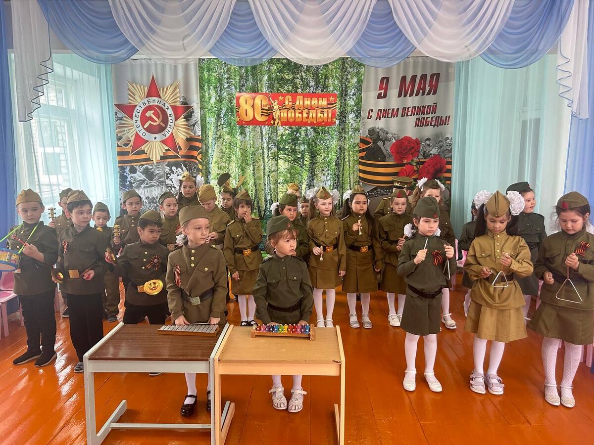 Хәрби форма кейгән малайҙар һәм ҡыҙҙар һуғыш тураһында йырҙар, бейеүҙәр, шиғырҙар башҡарҙы. Сараны әҙерләүҙә тәрбиәсе Гүзәлиә Ғайнанова һәм музыка етәксеһе Гөлназ Мөхәмәтйәнованың тырышлығы ҙур. #Победа80