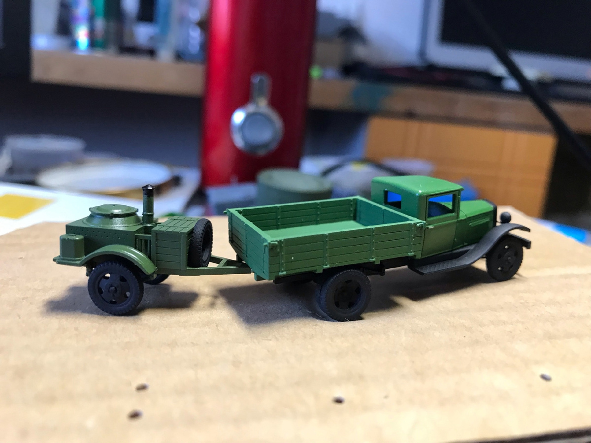 Ранее Студия «Миниатюрка» презентовала модель отечественного грузовика ГАЗ-АА/ММ в масштабе 1:87. На фотографиях собранная и окрашенная модель кухни позирует как раз с полуторкой. С исторической точки зрения такой сцеп не совсем корректен. ГАЗ-АА/ММ в отдельных случаях может и мог таскать кучную, но как правило его мощности для этой работы не хватало. Штатным средством для буксировки КП-41 был ГАЗ-ААА и его модификации.