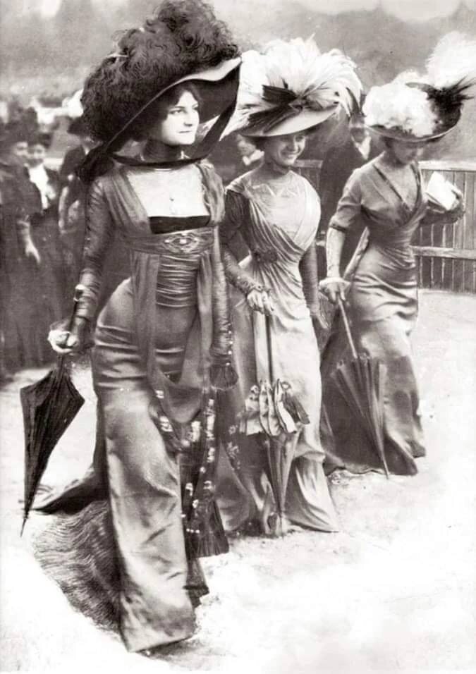 Собственно заглавный снимок и рассказывает нам о том, что могло произвести фурор в 1908 году. Это снимок девушек пришедших на ипподром в Париже. Уже вечером газеты объявили девушек возмутительными. Якобы на скачки они пришли полуголыми, да и вообще платья у них были уродливыми. Нюанс в том, что этот скандал сыграл скорее в плюс новой моде. Прошлое начало медленно отступать и все эти корсеты, и пышные наряды стали ассоциироваться с бабушками.