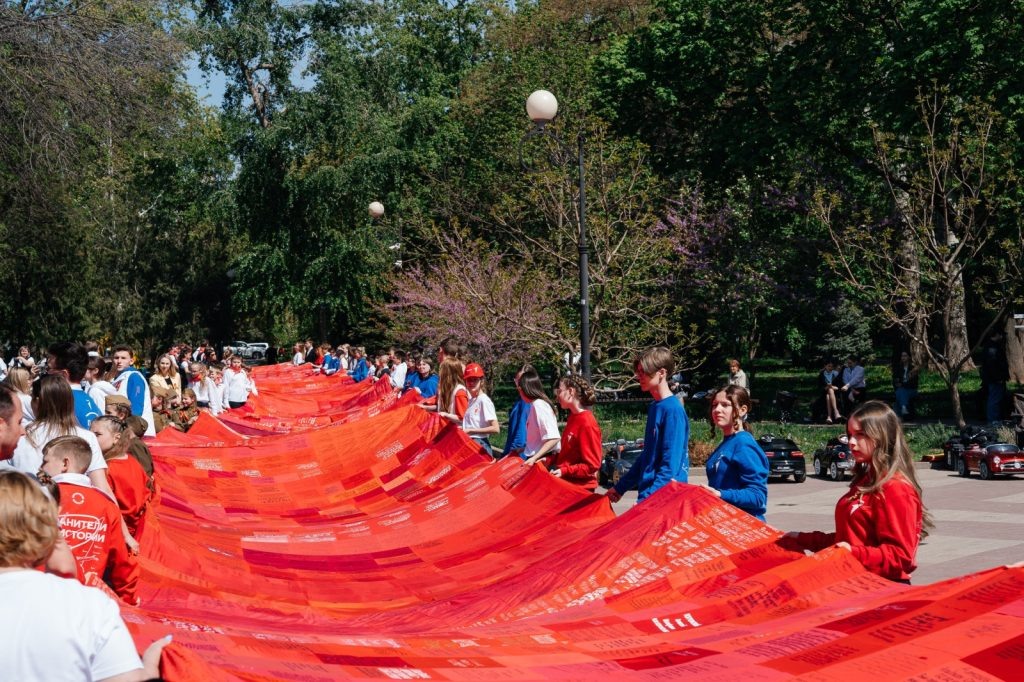 В 80-ю годовщину водружения знамени Победы над Рейхстагом на Дону завершилась патриотическая акция «Полотно Победы», в которой приняли участие более 35 тысяч дончан. Организаторы акции – активисты «Движения первых» и Ростовской региональной детско-молодежной общественной организации «Содружество детей и молодежи Дона». Самое большое полотно Победы протяженностью более 300 метров развернули перед Донской государственной публичной библиотекой. Ав общем в 55 муниципальных образованиях Ростовской области активисты подписали свыше 35 тысяч лоскутков с историями своих героических предков. – Мы подсчитали, если сшить все 55 знамен воедино, получится полотно высотой три метра и длиной более 2,5 километра. За месяц к нашей акции присоединились более 35 тысяч дончан – это воспитанники детских садов, школьники, студенты, их наставники, педагоги и родители. Акция нас очень сплотила. Это великолепный опыт по сохранению исторической памяти и патриотическому воспитанию детей и молодежи, – рассказала