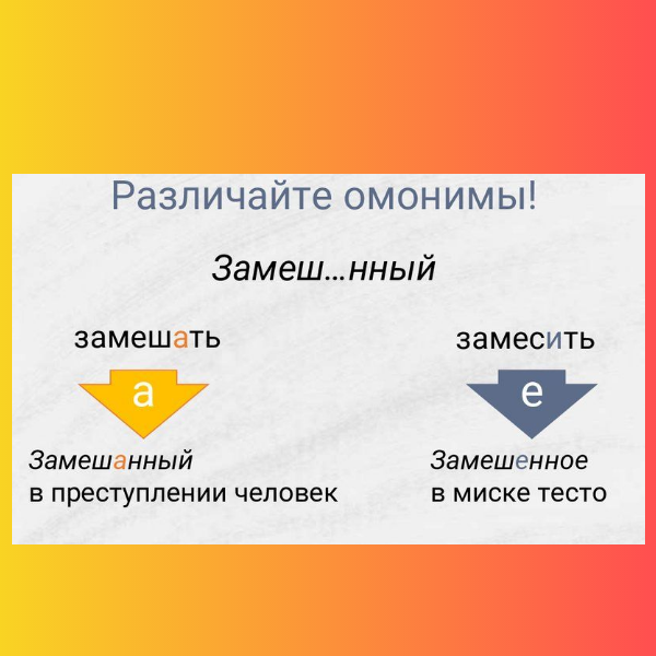Друзья, посмотрите на слова: они отличаются одной только буквой, но именно благодаря этому мы и различаем, какое слово имеем в виду. Но как понять, когда пишем А, а когда необходима буква Е? Давайте разбираться. 1.ЗамешЕнный Причастие образовано от глагола. ЗамешЕнный от инфинитива (что делать?) замесИТЬ. Важно учитывать здесь лексическое значение слова. Большой толковый словарь русского языка ЗАМЕСИТЬ. Приготовить однородную вязкую массу, размешивая, растирая что-л. в воде (в жидкости). Замесить тесто. Замесить глину. Расклеенный – расклеИТЬ, покрашенный – покрасИТЬ. 2. ЗамешАнный Замешанный от замешАТЬ. Большой толковый словарь русского языка ЗАМЕШАТЬ. Вовлечь кого-л. в предосудительное или преступное дело. Замешивать, -аю, -аешь; нсв. В это дело прошу меня не замешивать. Прочитанный – прочитАТЬ, рассказанный – рассказАТЬ. ЗамешЕнное тесто, замешАнный в преступном деле. Если трудно руководствоваться правилом, можно просто запомнить лексическое значение слов.