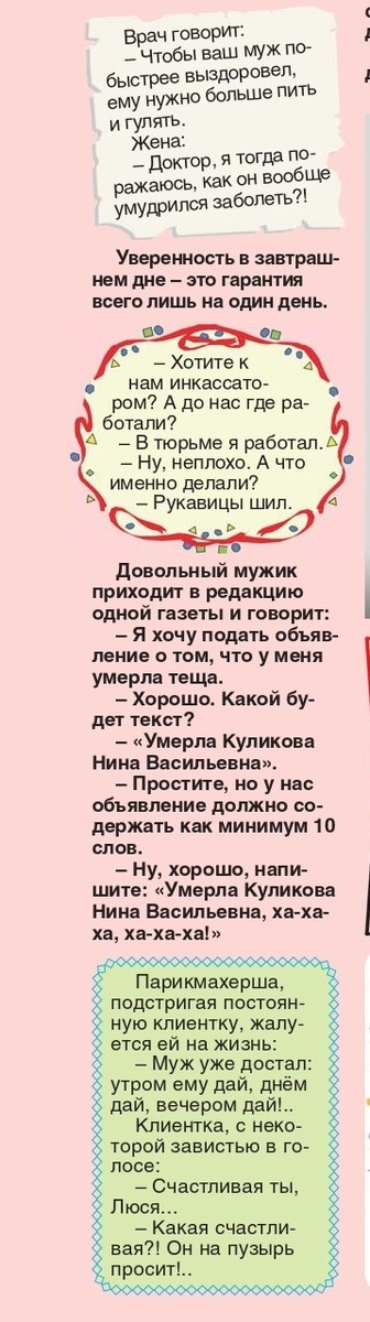 Здравствуйте, добрые люди! Вот так сходу оттарабанил я сразу аж 5 анекдотов. А чё мелочиться. Лечить так лечить, любить так любить, летать так летать, стрелять... ну и так далее. Мне эти анекдоты сегодня сосед по даче рассказал, он строится. Вывод: анекдоты ему, как и мне, строить помогают. Надеюсь и жить они (анекдоты) ему, как и мне, помогают. Ещё тут услышал анекдот про извилины в голове: Услышал, увидел, прочитал. Не с того я начал . Анекдоты, друзья, это не просто шутка. Это шутка с боооольшим смыслом. Конечно, если анекдот хороший, правильный. Вот именно - правильный. Правильные анекдоты особенно нужны в наше время. особенно - в России. Ладно. Расслабимся по-простому. Аптека. Суд. Нарколог.Вот не дай бог никому. К ним. Туда. Ну, в аптеку ещё можно. Согласен. Про ноги вообще говорить ничего не хочу, у меня их нет. Шутка. Идём на обоих ногах дальше: Ну, вот и пришли к хиппи энду. До новых встреч! Не скупитесь! А Россия победит, верьте мне. Держим кулаки за наших парней. Святых