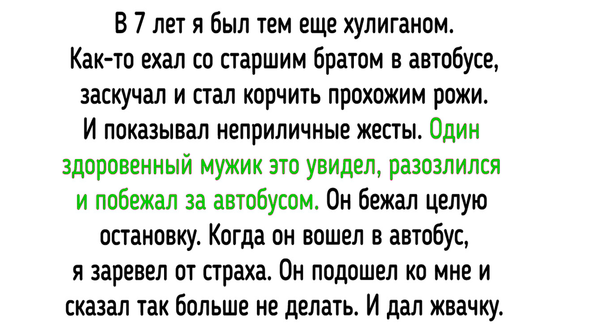 Когда автобус остановился на следующей остановке, этот мужчина вошел. Он тяжело дышал, но взгляд его был по-прежнему гневным и устремленным прямо на меня. В этот момент меня прорвало – я зашелся в рыданиях от страха. Он подошел, наклонился. Я ждал крика, наказания, но он лишь тихо и твердо сказал: «Мальчик, так больше не делай. Это очень некрасиво». А потом, к моему полному изумлению, полез в карман, достал жвачку и протянул мне. Этот простой жест, сочетающий твердый урок и неожиданную доброту, врезался в мою память навсегда, научив больше, чем сотня нотаций. До сих пор помню вкус той жвачки и взгляд того незнакомца.