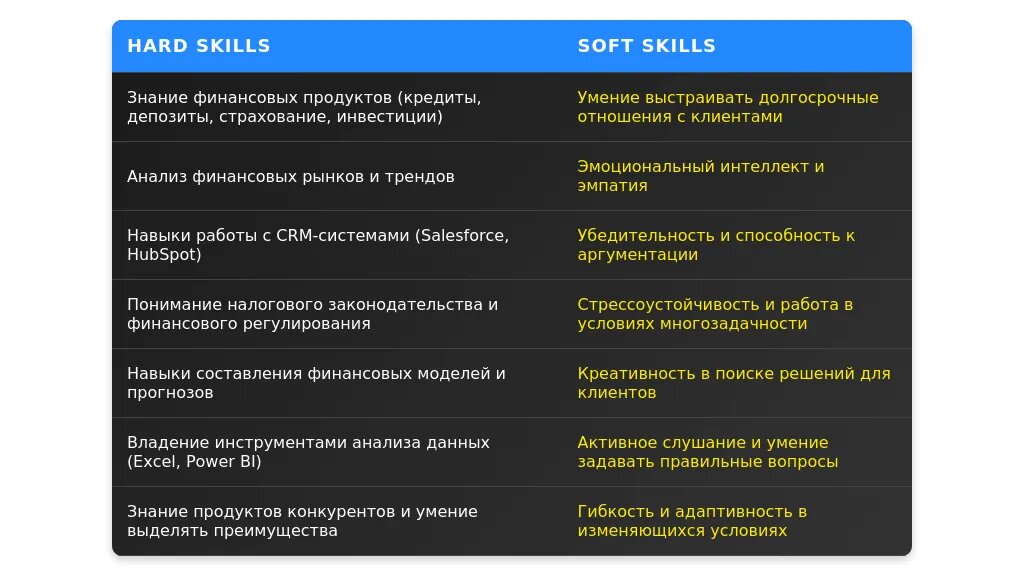 После адаптации: "Продвинутые навыки работы с Excel и CRM-системами (Salesforce, Bitrix24). Знание инвестиционных продуктов и страхования. Опыт работы с корпоративными клиентами."