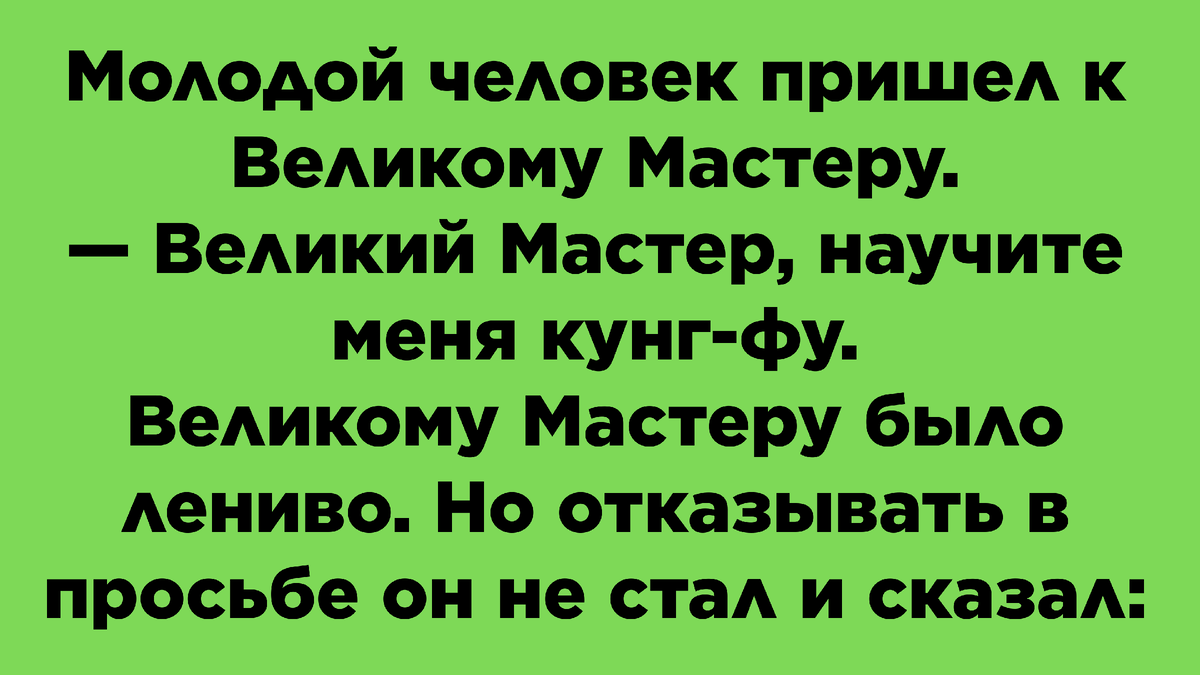 — Великий Мастер! Три года каждое утро я смотрел, как восходит солнце, и каждый вечер — как оно садится. Научите меня кунг-фу.