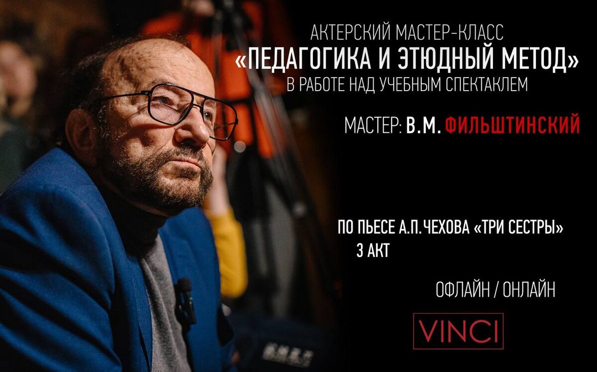 В Театральной гостиной VINCI пройдет мастер-класс с Вениамином Фильштинским «Театральная педагогика и этюдный метод как способ создания спектакля». Мастер-класс проходит в формате практического занятия со студентами лаборатории «Наш Чехов: Три сестры», работающими над созданием учебного спектакля с педагогами магистрантами Фильштинского методами его Мастерской 51 (РГИСИ). На мастер-классе будут представлены работы по третьему акту пьесы, созданные этюдным методом, проявлена природа и логика создания этюда, наглядно показан процесс работы над материалом, пробы студентов и комментарии Фильштинского создадут ясное представление о том, каким образом этот метод позволяет продвинуться в создании учебного спектакля. ДЛЯ КОГО Для актёров, режиссёров, поступающих, педагогов и людей творческих профессий, желающих увидеть процесс погружения в методологию и понять как возникает знаменитая этюдность. МАСТЕР Профессор Вениамин Михайлович Фильштинский — театральный режиссёр, педагог, профессор, з
