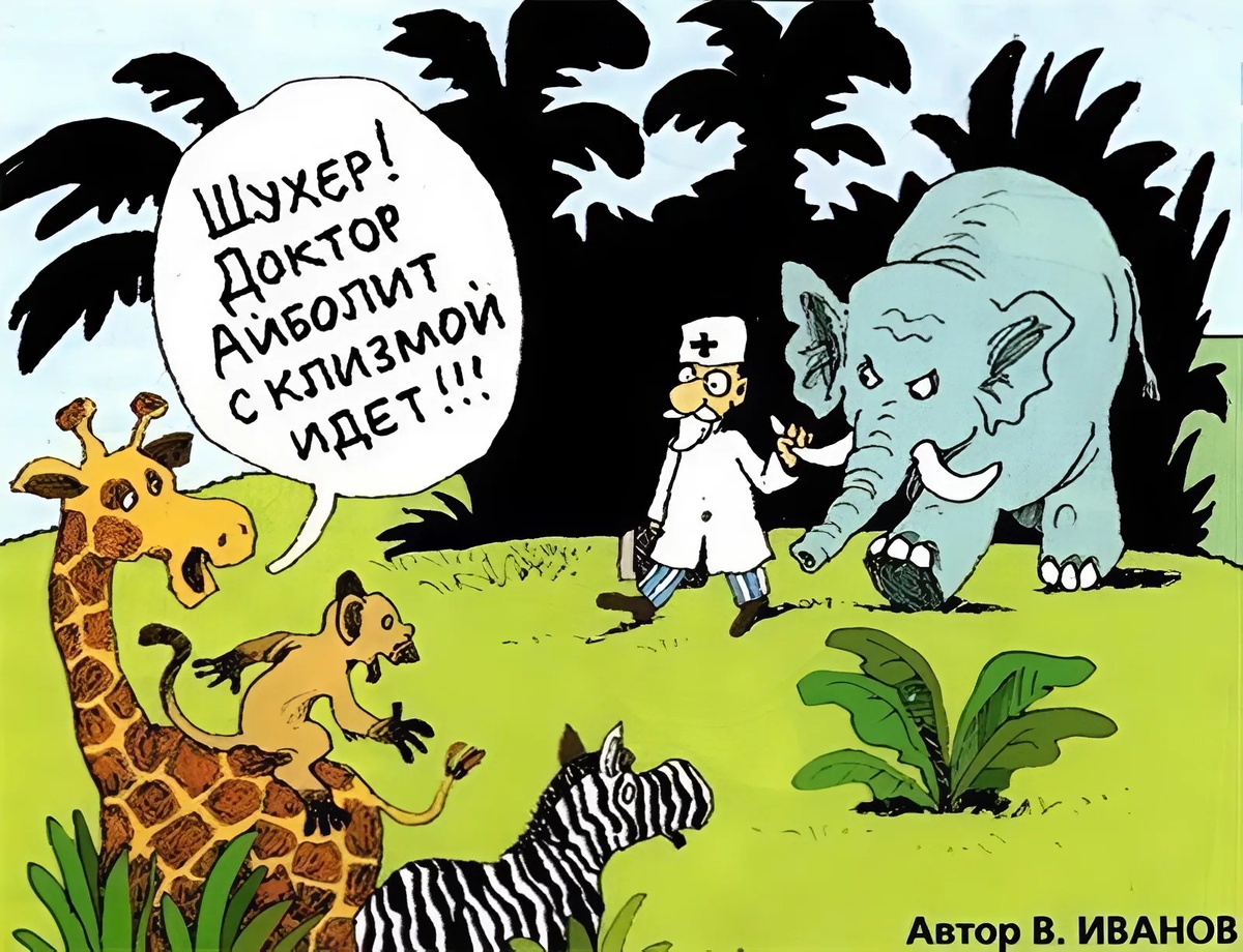 Юмор у Иванова не милый, тут вы не найдёте мимимишных сценок. И если очаровательный пёсик появился на рисунке, то жди от него подвоха. Тигр в два счёта слопает зоозащитников, доктор Айболит уже не такой добряк. Ещё в карикатурах довольно много отсылок к сказкам, поговоркам, есть каламбуры.