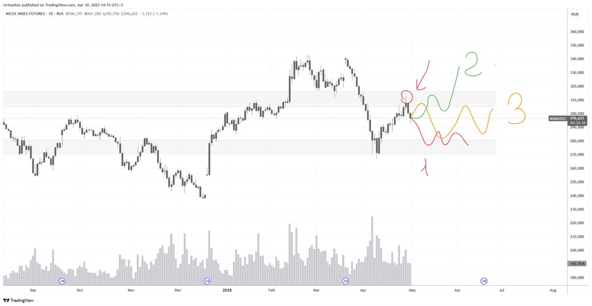 #аналитика 🇷🇺Российский рынок Сегодня показывает динамику в рамках ожиданий - бесконечные вербальные интервенции об "успешном успехе" на геополитическом фоне сильно утомляют 🥱 Впереди майские праздники и тонкий рынок - все маркетмейкеры будут на даче возделывать грядки...😁 Ну а если серьёзно, то наш рынок плавно входит в мёртвый сезон. До осени, если верить сезонной статистике с 1998 года, динамика акций нас не порадует лихими виражами 🎢 Могу предположить три таких сценария, как на скриншоте выше. Наверное, самым вероятным будет 3-ий. Этот вариант для меня базовый. Но это не точно 😎