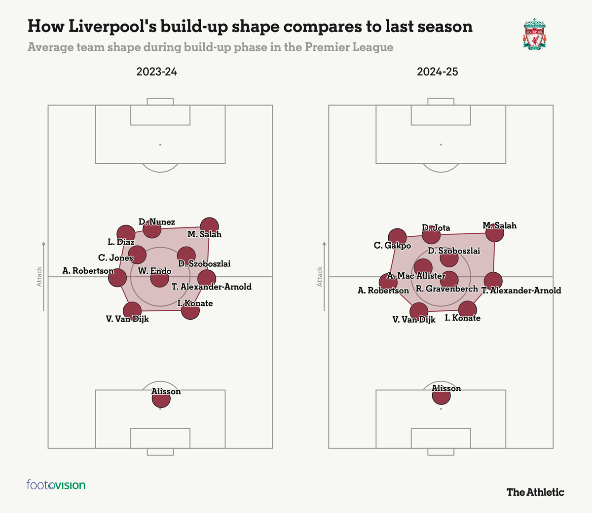 Используя данные Footovision, вы можете увидеть тонкие различия в билд-апе «Ливерпуля» в течение всей кампании. Если в прошлом сезоне линия обороны была более узкой, а тройка полузащиты — более распределенной, то при Слоте все было наоборот. Его команда чаще придерживается традиционной четверки в защите, а компактная тройка в полузащите расставляется в разных плоскостях поля — примерно так же, как Слот в «Фейеноорде».