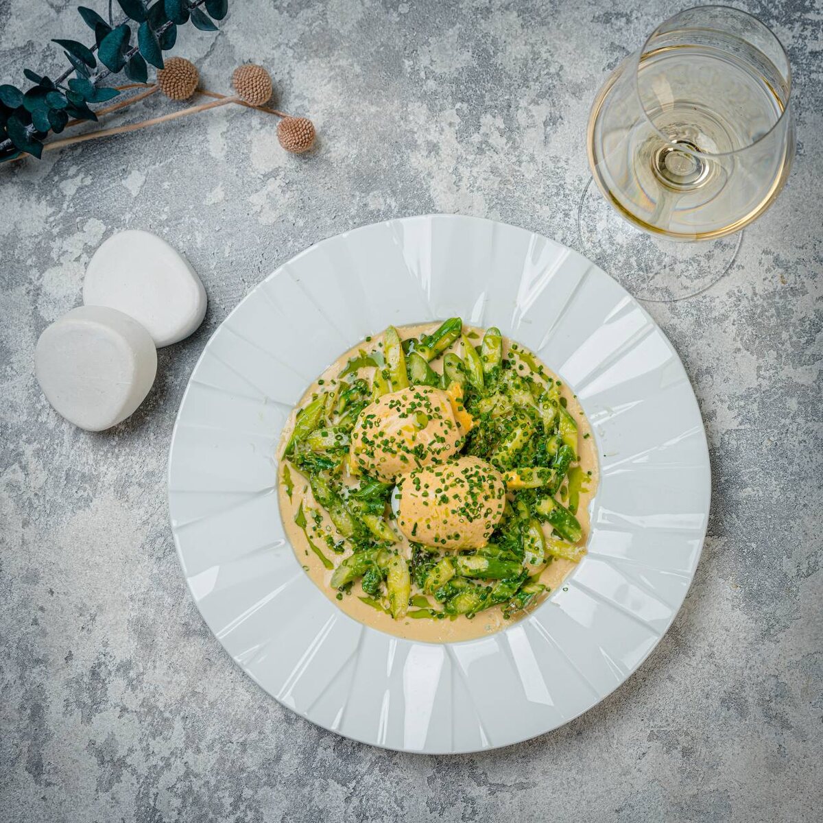 Сразу два варианта идеальной на самом деле пары к шампанскому: попроще, со спаржей и соусом из пармезана (950₽), и посложнее, с карпаччо из осьминога и картофеля, с соусом из анчоусов и каперсов (1250₽).