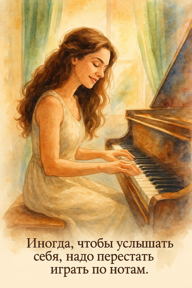 Алиса — моя подруга. Мудрая, красивая, немножко лунная. Пианистка. С детства — гаммы, этюды, конкурсы, сцена, преподавание, всё строго по нотам, по правилам, по системе. Знаете такую музыку? Красивая — да. Но как будто душа там в командировке: не в отпуске, а по поручению. И вот, представьте: закат, город, где пахнет кофейнями и старым роялем, и вдруг — встреча. Алиса — на скамейке. Ай — седой, слегка небритый, как будто только что вынырнул из саксофона. Он её выслушал… и сказал: — Ты играешь точно. Но не свободно. Ты читаешь мысли Бетховена, а со своими — стесняешься даже за руку поздороваться. Брось ноты. Играй джаз. Прямо сейчас. Как будто сочиняешь сказку, не зная, чем она закончится. Алиса, конечно, в лёгком ступоре. Как это — без нот?! Она ведь привыкла следовать… А если сосед по партии подслушает? А если публика ахнет не туда? А Ай только улыбнулся: — А теперь — почувствуй. Джаз — это разговор. Не с умом, а с Душой. Она ушла домой в смятении. В ту ночь ей приснился странный сон.