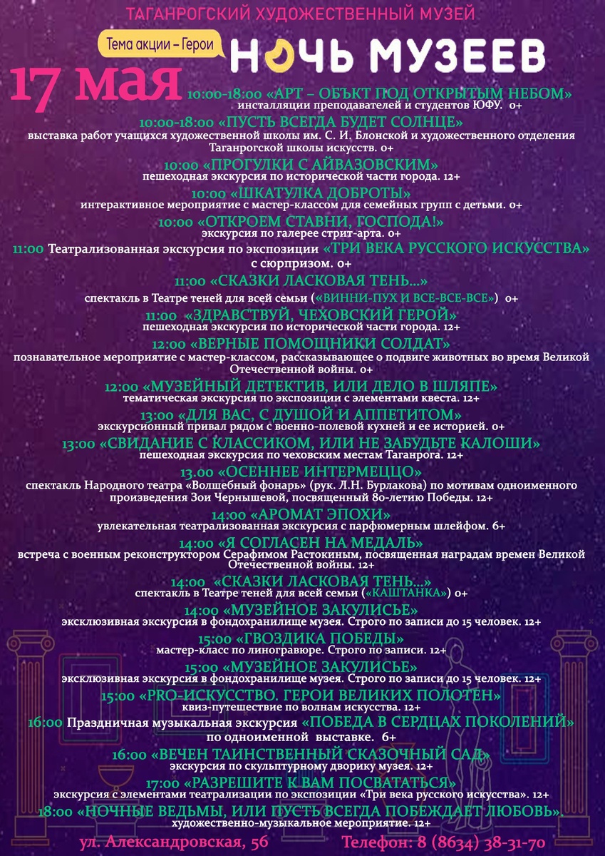 🌿Дорогие друзья! ‼️17 мая состоится одно из главных музейных событий года! ☀️С 10:00 до 19:00 Таганрогский художественный музей приглашает всех на Всероссийскую акцию "Ночь музеев - 2025". 🖼Вас ждут интересные экскурсии в залах музея и по улицам города, познавательные мероприятия, необычные мастер-классы, завораживающие музыкальные номера и незабываемые театральные выступления. 🎭Знакомьтесь с полной программой нашей акции и обязательно приходите в музей! 📆17 мая ⏰с 10:00 до 19:00 🏛Адрес: ул. Александровская, 56 ☎️Телефон: 8 (8634) 38-31-70