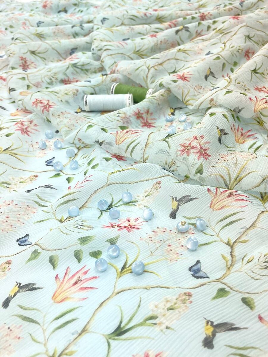 Нежнейший жатый шёлковый шифон в нежно-голубом цвете с очаровательными бабочками.
