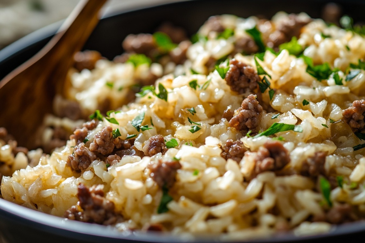 Создано на основе запроса: Title: French Onion Ground Beef and Rice Casserole | STYLE: Close-up Shot right view | EMOTION: realistic as