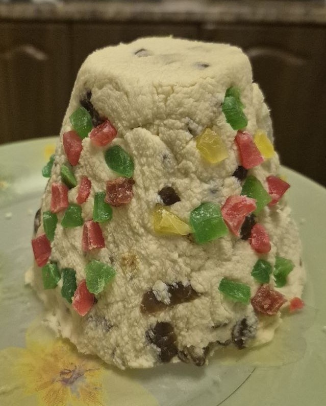 Далее, если у Вас есть пасочница, укладываем массу в нее, предварительно уложив в нее марлю, ставим сверху груз и оставляем в холодном месте на сутки, чтобы стекла лишняя жидкость.