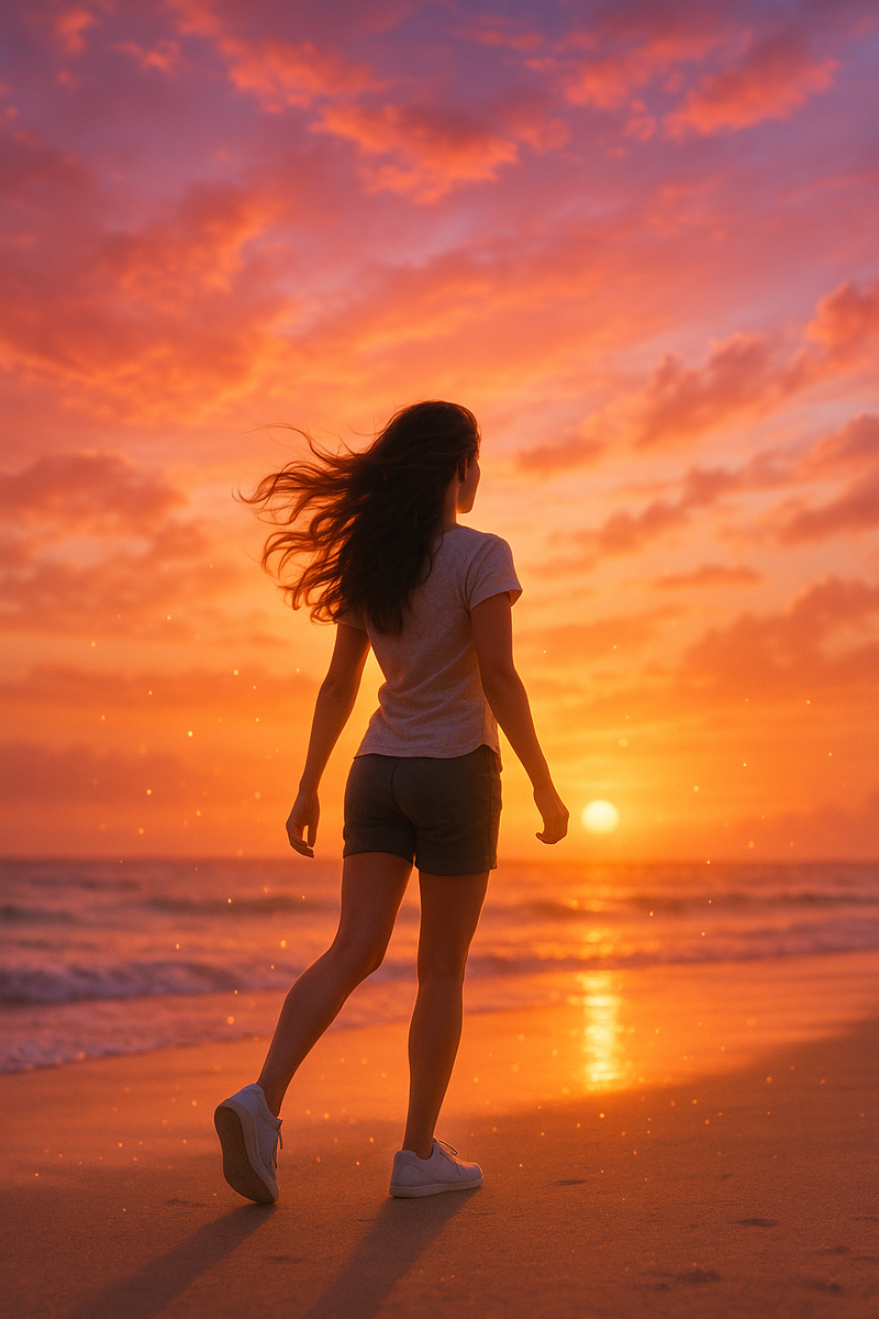 Она — как душа на границе между прошлым и будущим, ступающая босиком по мягкому песку времени. За её спиной — всё, что было: любовь, боль, уроки и мечты. А перед ней — рассвет, озарённый огнём её собственной души, словно Вселенная открывает перед ней врата новых возможностей. Она не убегает от прошлого — она благодарит его за силу, что теперь ведёт её вперёд. Ветер играет её волосами, как будто сама жизнь говорит: «Ты готова». В этот миг она не просто идёт — она перерождается.