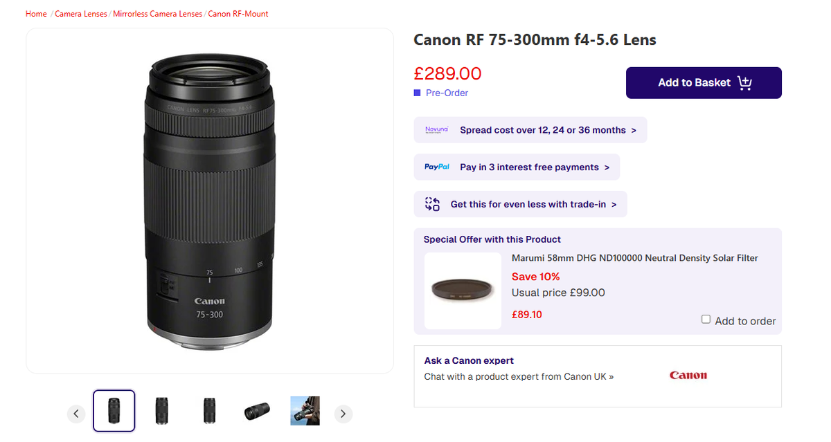 На данный момент объектив RF 75–300mm f/4–5.6 не представлен на рынке США. Возможной причиной этого может быть ожидание пошлин или стратегические маркетинговые решения Canon. Однако объектив доступен в Европе и других регионах, включая Германию.