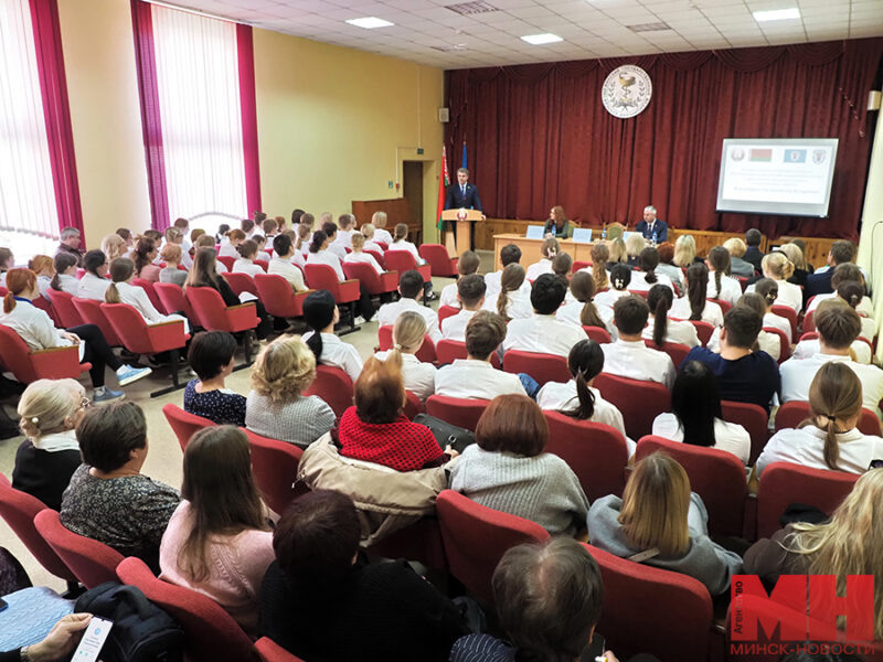 Председатель Мингорисполкома Владимир Кухарев встретился с коллективом и учащимися Минского государственного медицинского колледжа 30 апреля. Он рассказал о развитии столицы, в частности сферы здравоохранения, а также ответил на вопросы, передает корреспондент агентства «Минск-Новости». На встрече также присутствовал глава администрации Партизанского района Николай Поляков. — Важно, что всё больше молодых людей выбирают медицинские специальности и в дальнейшем идут работать в систему здравоохранения, — отметил В. Кухарев. — В этом году в Минске откроется восемь новых объектов здравоохранения, которые нужно укомплектовать кадрами. Он также сказал, что в ответ на растущий спрос на медицинские кадры увеличены цифры приема в колледжи и вузы. При этом необходимо, чтобы и учебные заведения, и больницы были оснащены современным оборудованием для диагностики и проведения сложных операций. — Очень важно, когда специалисты высказывают предложения, ведь они знают проблему изнутри. Это позволяет р
