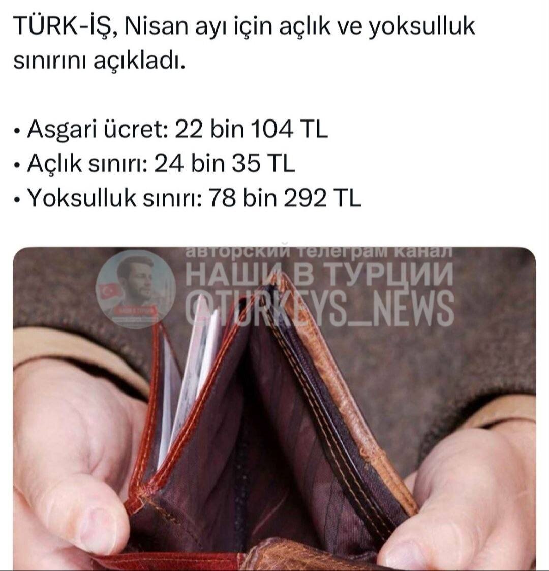 🇹🇷 В ТУРЦИИ УРОВЕНЬ БЕДНОСТИ ПРЕВЫСИЛ 78 ТЫСЯЧ ЛИР Согласно апрельскому отчёту профсоюза TÜRK-İŞ: — Прожиточный минимум для семьи из 4 человек: 78 292 лиры — Порог голода: 24 035 лир — Минимальная зарплата: 22 104 лиры Это означает, что даже минимальной зарплаты не хватает на еду, не говоря уже об аренде, одежде и транспорте. TÜRK-İŞ называет ситуацию тревожной и требует срочных шагов от властей. 📌 Подписывайся на TurkeyNews Следим за новостями Турции