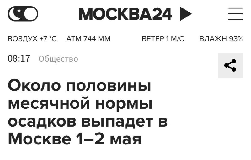 Майские в Москве пройдут по сценарию «ноябрь вернулся». 1–2 мая обещают мокрый снег, ливни и до половины месячной нормы осадков. Температура в столице — от 0 до +5°C, в Подмосковье местами до -1°C. Так что мангал, пуховик и резиновые сапоги — главный лук на праздники. 🌧🥶 Подробнее: https://hard-tm.su/threads/88335/ 🕹HARD-TM — Подписаться
