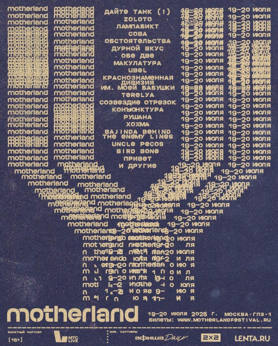 Крупнейший московский фестиваль независимой музыки Motherland пройдет 19 и 20 июля Всего на четырех сценах за два дня выступят более 40 групп. В их числе — «Дайте танк (!)», Zoloto, «лампабикт», «Сова», «Обстоятельства», «Дурной вкус», «Обе Две», «Краснознаменная дивизия имени моей бабушки», «Созвездие Отрезок», «конъюнктура», «Хохма», bird bone, «Привет», Bajinda Behind The Enemy Lines и другие. https://bg.ru/bg/city/city-news/27058-mother-land ❤ «Большой Город»