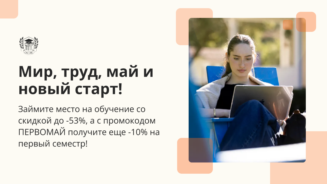 Займите место на обучение со скидкой до -53%, а с промокодом ПЕРВОМАЙ получите еще -10% на первый семестр! 🌟 В ОСЭК всё продумано до мелочей: ✔дистанционное обучение без разъездов; ✔расписание, которое вы выбираете сами; ✔простое поступление без конкурсов, ОГЭ и ЕГЭ; ✔преподаватели — практики, всегда готовые помочь; ✔два диплома без доплат. 🔥Поступайте с жаром! Успейте до 12 мая, потом цены повысятся.