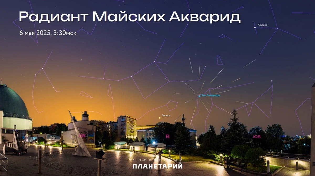 Майское небо порадует звездным дождем из созвездия Водолей. С 19 апреля по 28 мая 2025 действует метеорный поток эта-Аквариды (ŋ-Аквариды) или Майские Аквариды. Пик активности Майских Акварид произойдет в ночь 6 мая 2025года в 6:00 мск, ожидается до 40 метеоров в час. Родительское тело потока: комета Галлея Время наблюдения: под утро, с 2:00 и до рассвета. Куда смотреть: на юго-восточный горизонт, ориентир – Летний Треугольник. Радиант располагается левее (восточнее) и ниже звезды Альтаир. Смотреть на область неба между горизонтом и астеризмом Летний Треугольник. Как наблюдать: метеоры наблюдают невооруженным глазом. Условия наблюдения Майских Акварид в 2025 году – не совсем благоприятные. Луна в фазе последней четверти стремится к полнолунию (12.05.2025), что существенно помешает наблюдению метеоров.